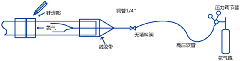 b.銅管焊接時必須持續(xù)充氮保護,避免銅管內(nèi)壁產(chǎn)生氧化皮雜質(zhì);充氮壓力不需很大,微微有氣出來通過焊點即可;